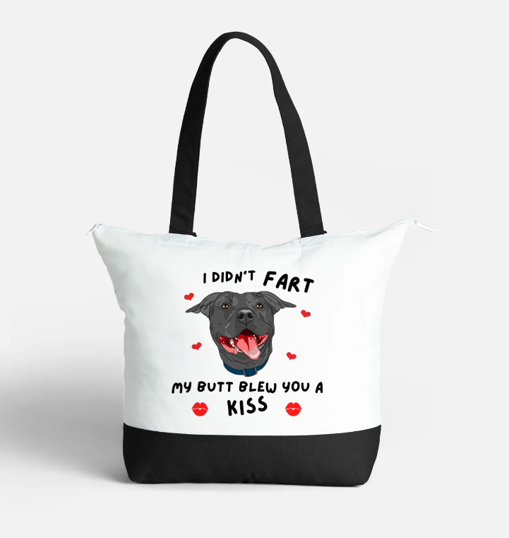 Staffy Tote Bags. Unique white canvas shopping bags with various fun designs to suit all dog lovers. 100% cotton canvas bag with zipper for main compartment plus additional inside zippered pocket. Double black carry handles with 21 litre capacity. Stylish, sturdy, unique designs for all dog lovers to enjoy.